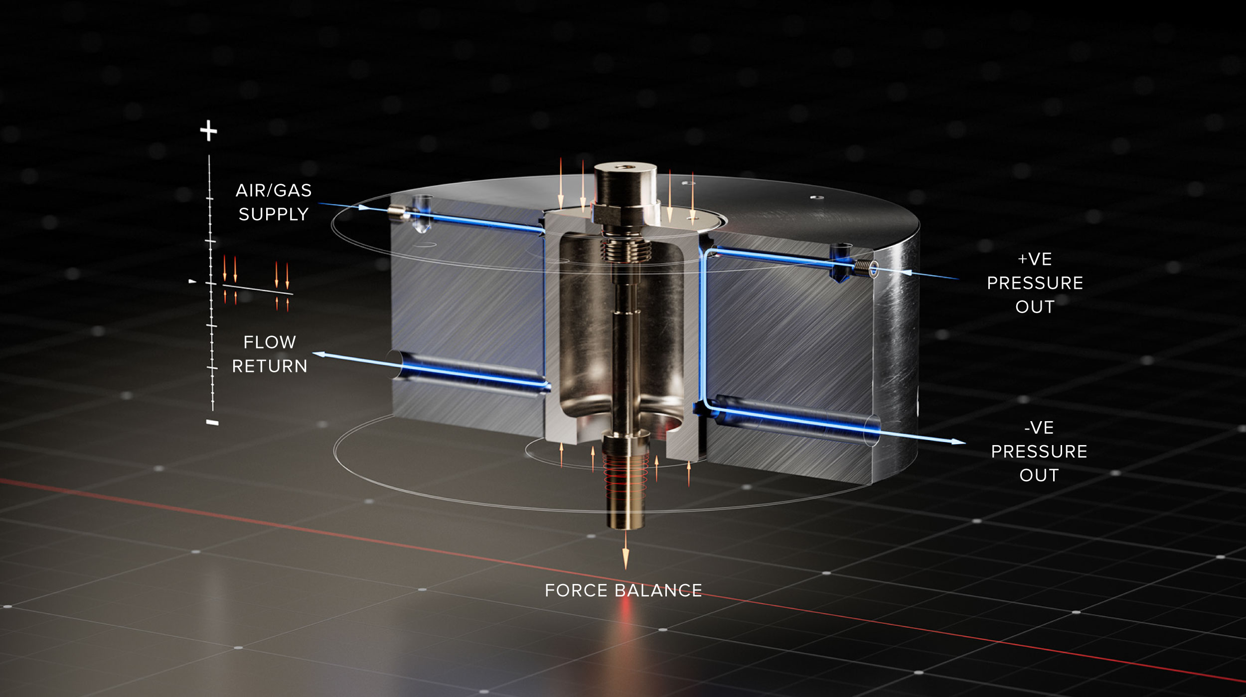 Der FRS4 nutzt ein innovatives Strömungsprinzip zur präzisen Druckregelung: Gas- oder Luftzufuhr erfolgt über den oberen Zylinderanschluss, während der Rückfluss zur Basis geleitet wird. Ein speziell entwickelter Zwischenraum zwischen Kolben und Zylinder erzeugt eine kontrollierte Druckdifferenz, die für hochgenaue Anwendungen entscheidend ist. Für maximale Stabilität sorgt ein flexibles Beryllium-Kupfer-Lagerungssystem, das die Kolbenposition zuverlässig führt und durch ein ausgeklügeltes Kräftegleichgewicht ergänzt wird.