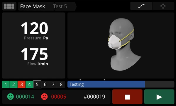 Diese Normen gewährleisten, dass die Masken sicher zu tragen sind und die natürliche Atmung nicht zu sehr beeinträchtigen, sowohl beim Einatmen (Unterdruck) als auch beim Ausatmen (Überdruck). Die Maskenprüfstation basiert auf dem Furness Controls FCO792 Flow Tester und umfasst alle fortschrittlichen Funktionen dieses Geräts, mit automatisierten Abläufen, flexibler Kommunikation und vollständiger Integration mit Vorrichtungen und anderen Maschinen.